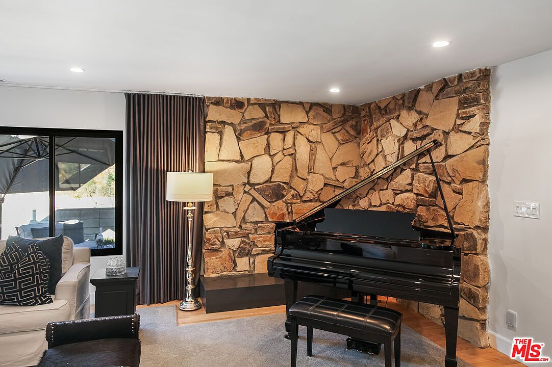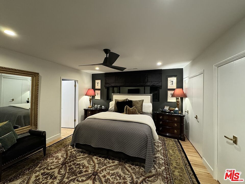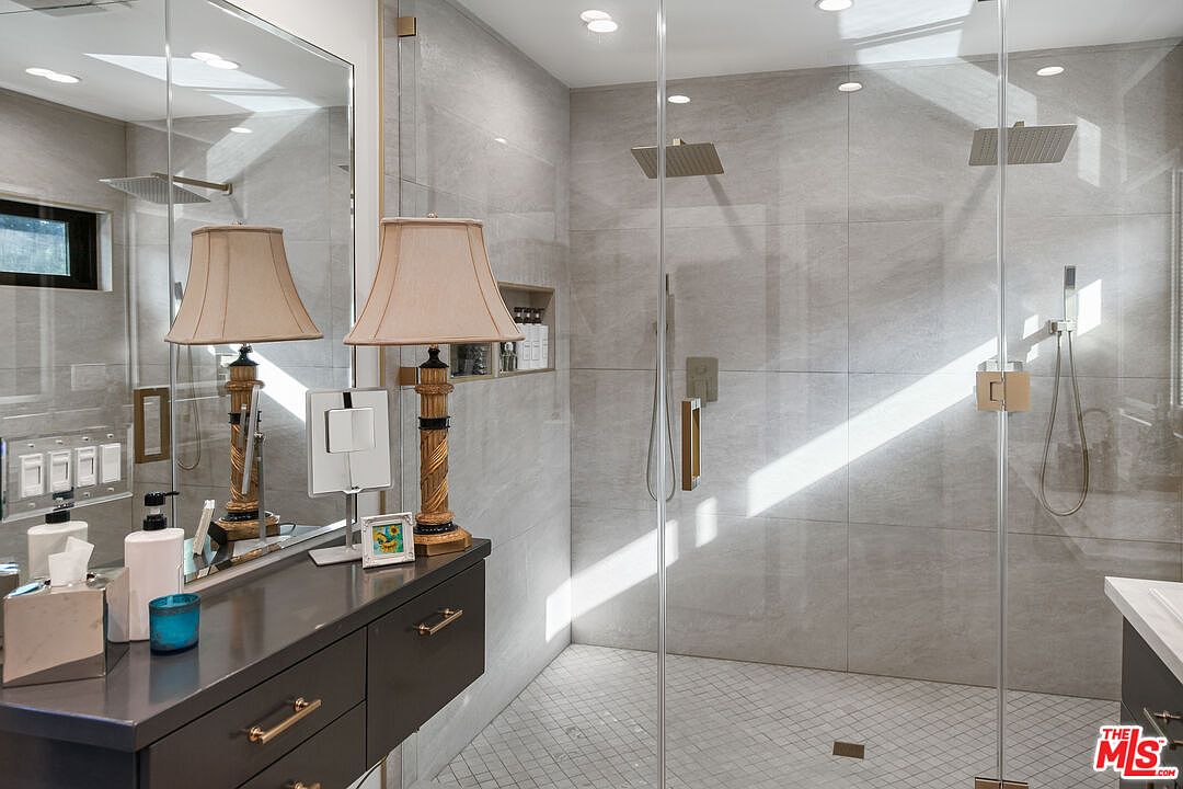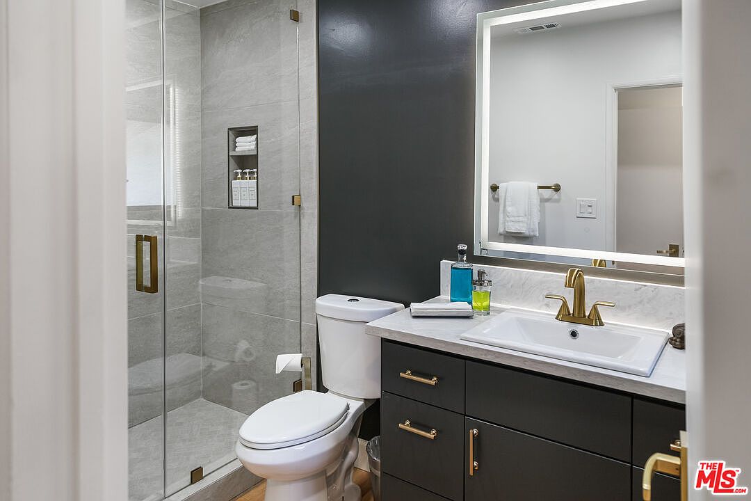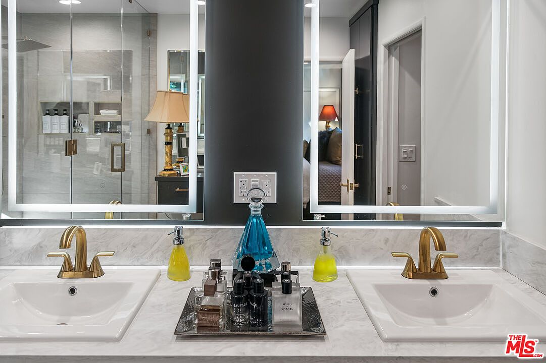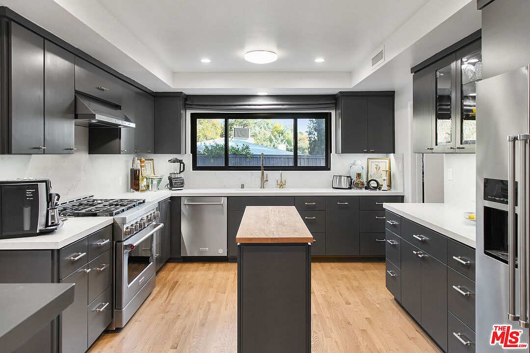 The gourmet kitchen is anchored by top-of-the-line appliances, deep charcoal cabinetry, a butcher-block island, and a wall of marble behind the range. Two potential primary suites, one on each level, with the upstairs suite featuring a soaking tub and dual vanities. A new roof, a fully gated lot, rear access parking from Sepulveda Lane.
