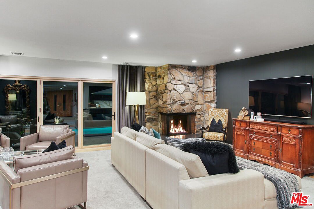 “Expansive outdoor spaces, including a private pool, seamlessly connect to the indoors through folding glass doors, making it ideal for year-round entertainment.”